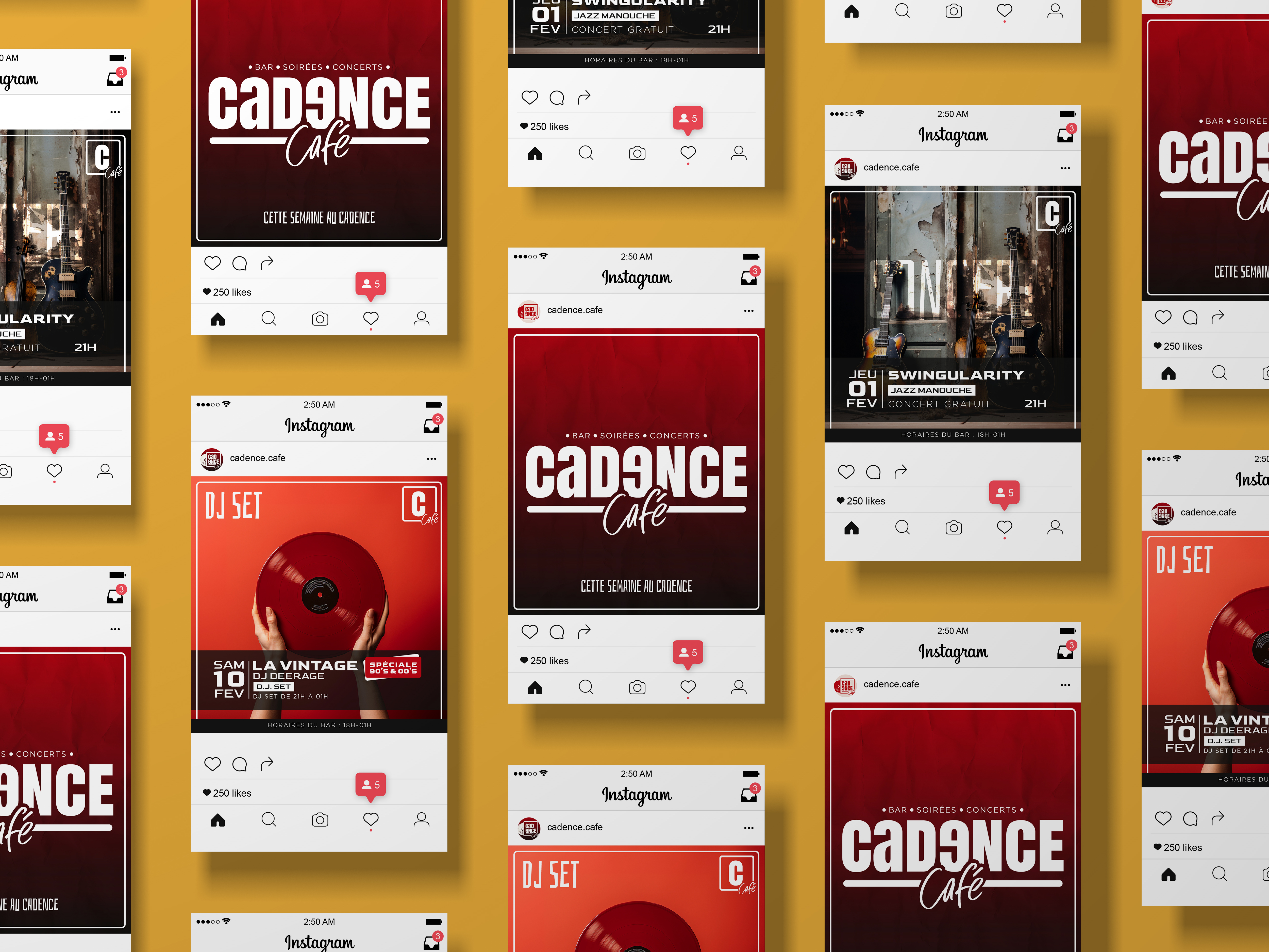 Bar convivial ouvert en 2019 dans lequel la musique a une place toute particulière, le Cadence souhaitait effectuer un rafraîchissement de son identité visuelle pour qu’elle puisse mieux correspondre à sa clientèle, et redynamiser sa communication.