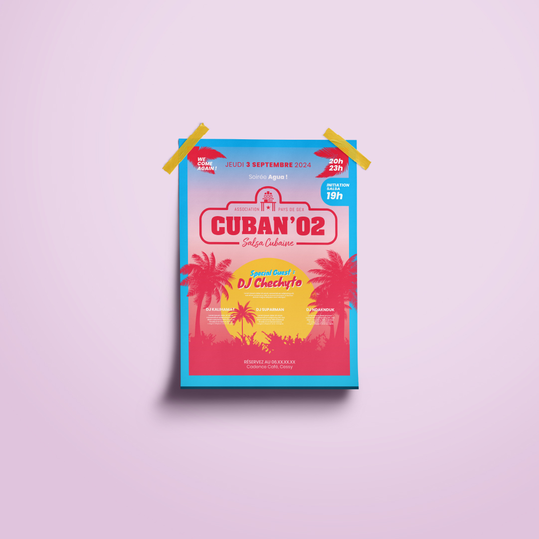 Cuban’O2 m’a contacté durant l’été 2024 pour effectuer une refonte de leur identité visuelle. En associant des codes graphiques issus de la culture cubaine avec des couleurs vives rappelant les rues de la Havane, l’association souhaitait mettre en avant l’ambiance solaire et conviviale des cours et soirées qu’elle propose dans le Pays de Gex.